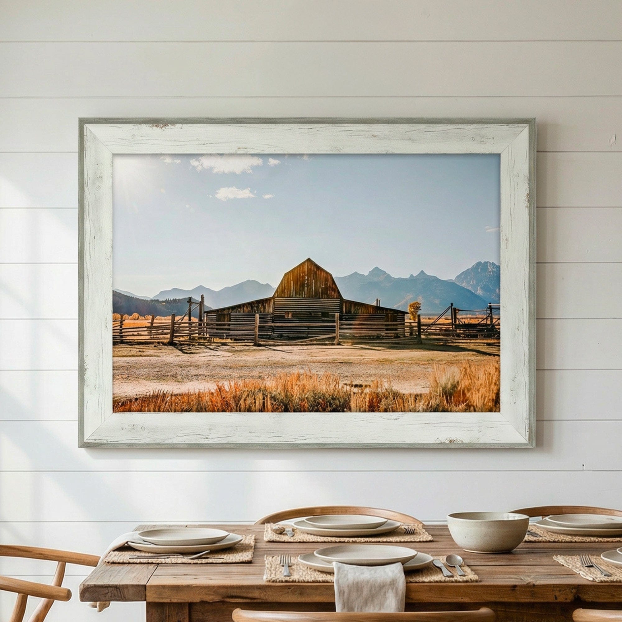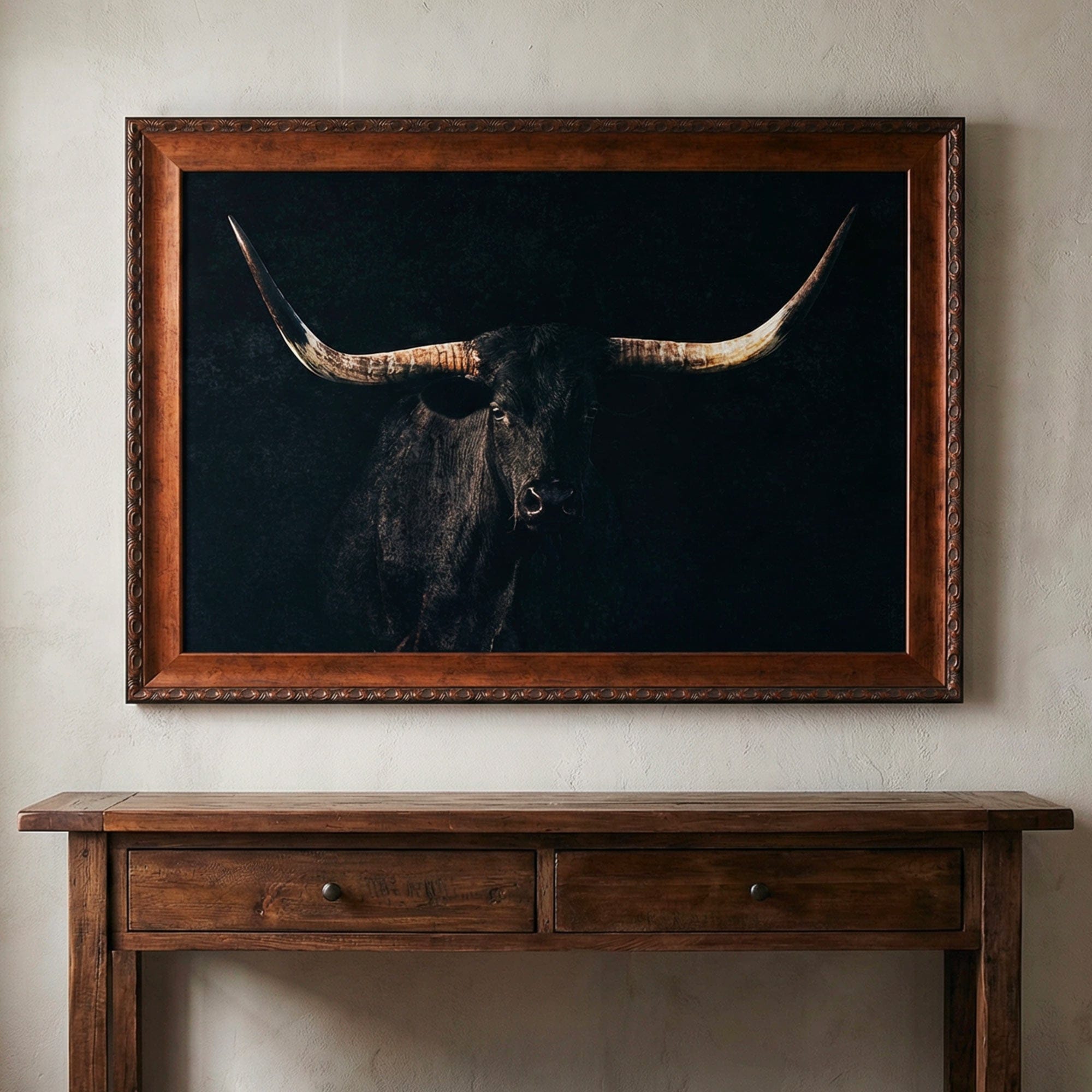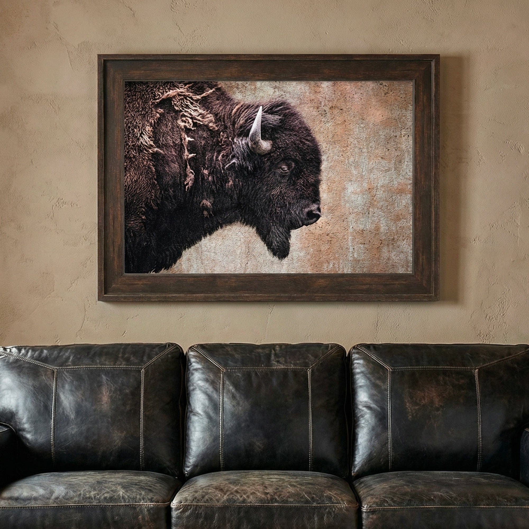 Rustic living room showing a framed western wall art print in a solid wood frame. This example highlights how framed western wall art adds warmth, scale, and a strong focal point above seating in ranch, lodge, and modern western interiors.