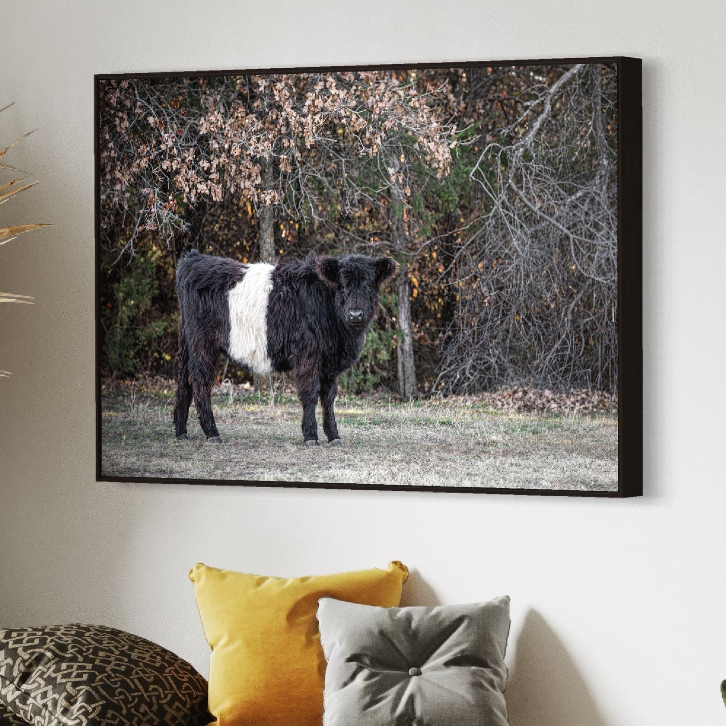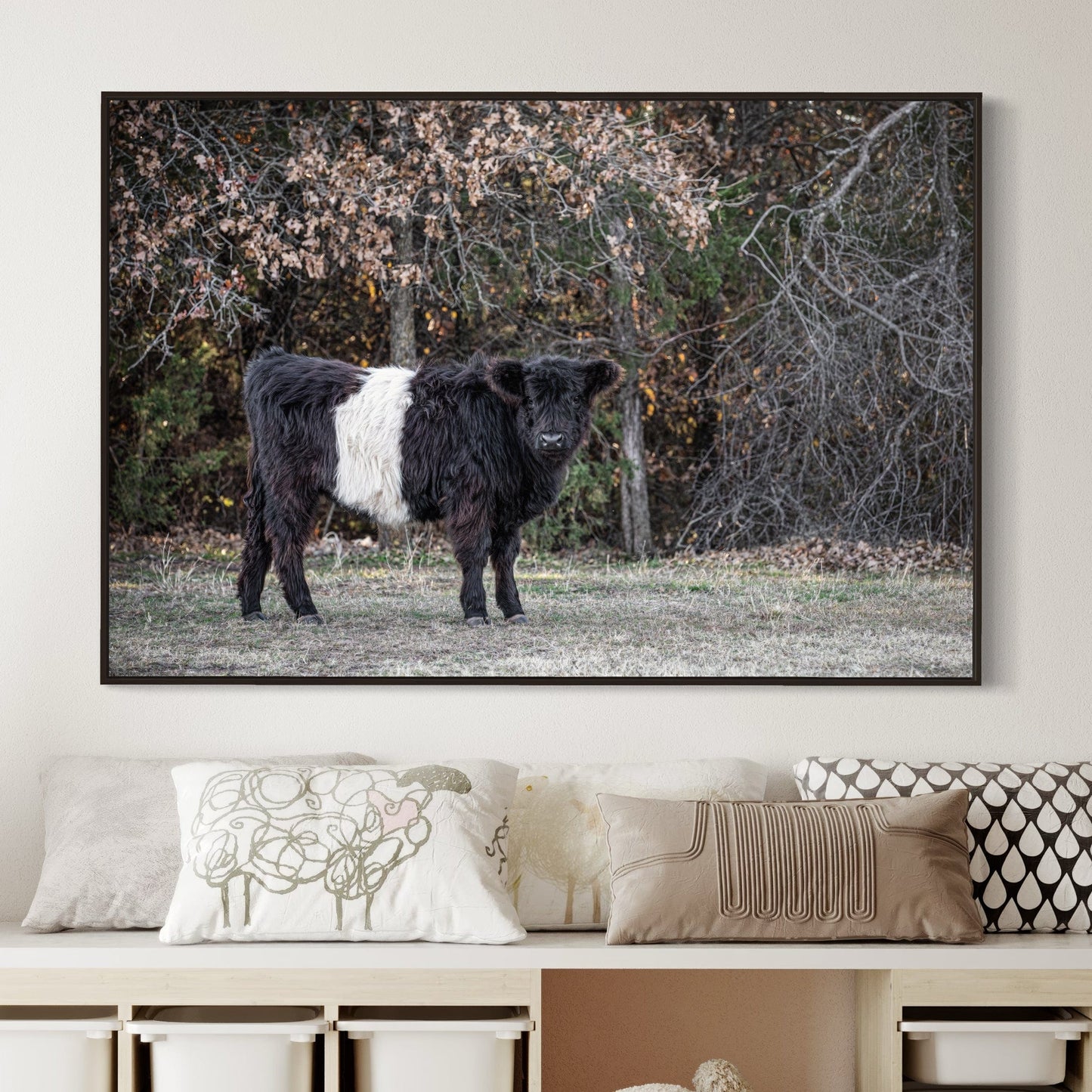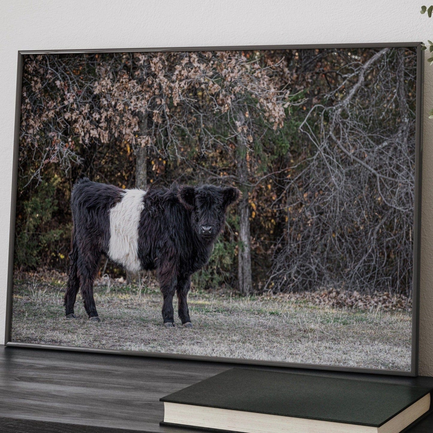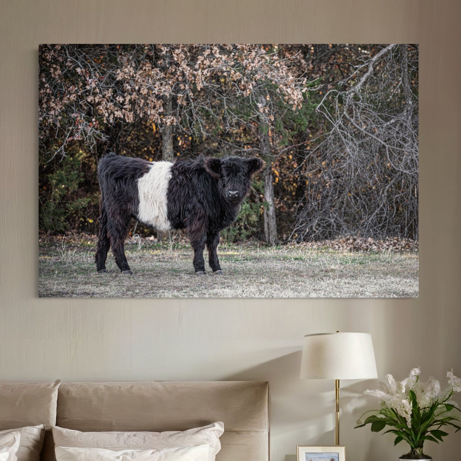 Our Beltie Cow Photo is a beautiful way to introduce the calm and grounding vibes of farm life into your living area. With attention to every detail, this photo invites viewers to enjoy the distinct look of the Belted Galloway cow.