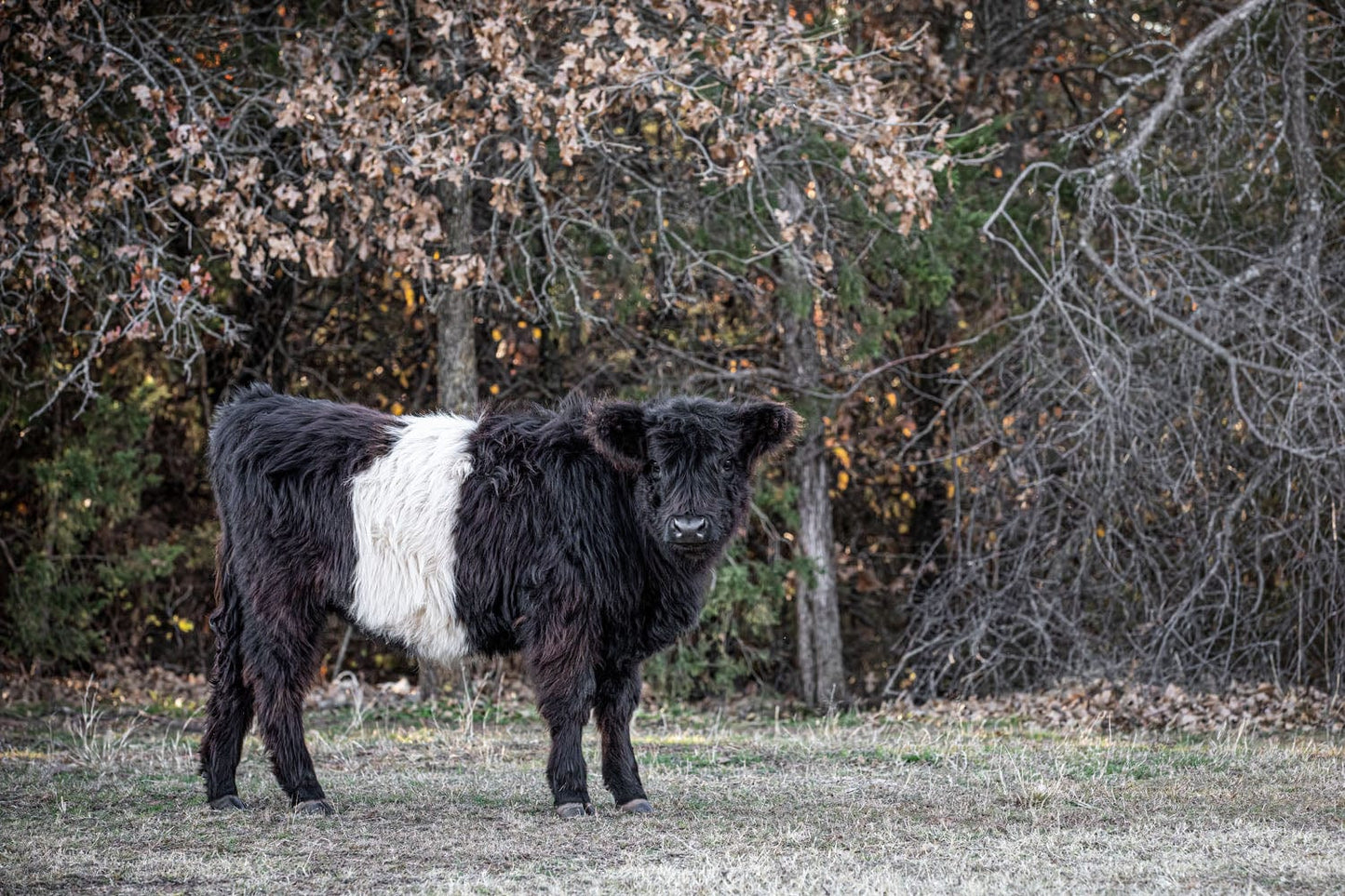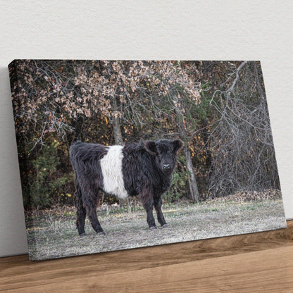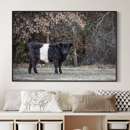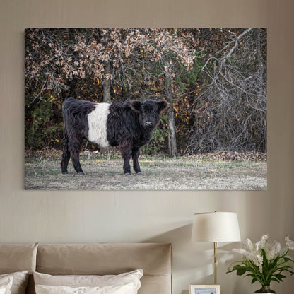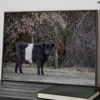 Dive into the countryside charm with our Beltie Cow Photo. This piece captures a Belted Galloway cow, known as a 'Beltie,' standing in front of a gentle background of trees. Perfect for anyone who loves the rustic beauty of farm life or wants to add a peaceful touch of nature to their home.