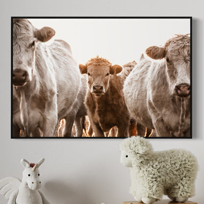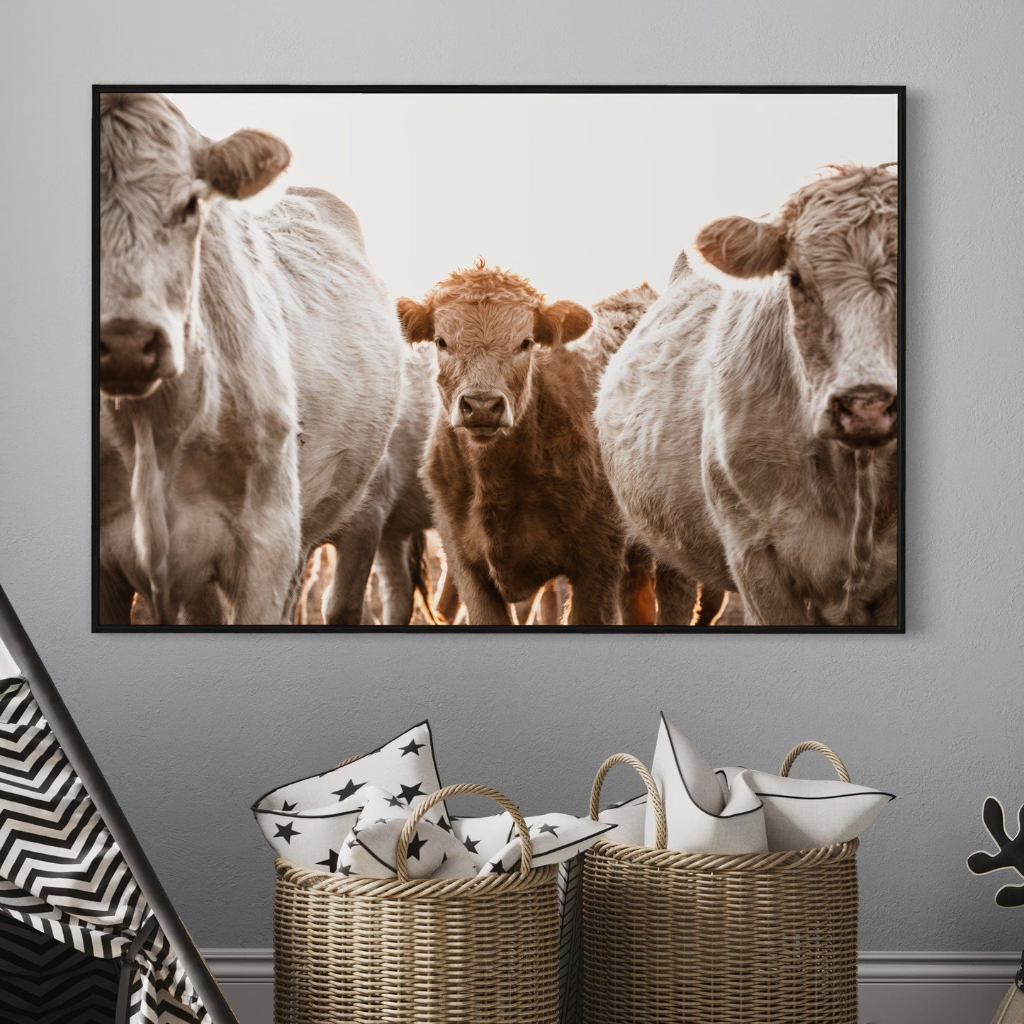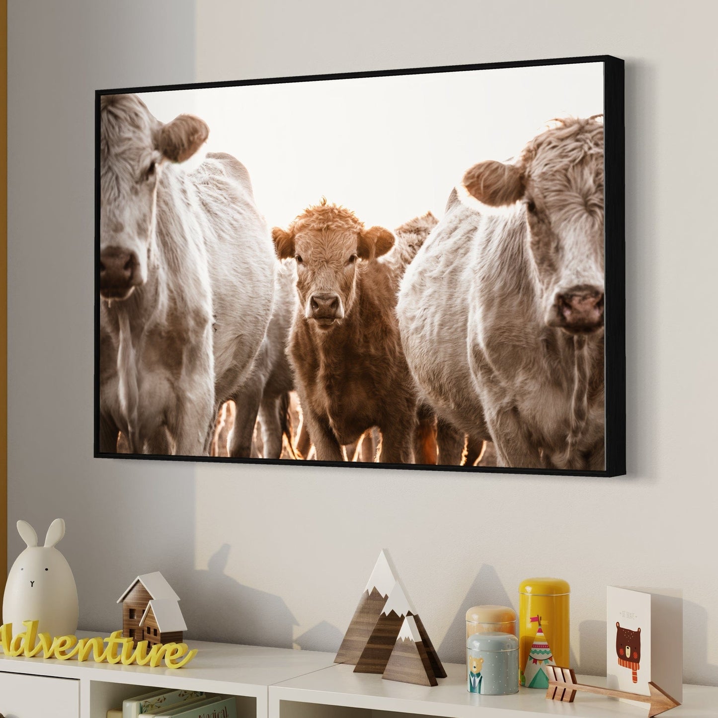 Transform your little one's nursery into a western wonderland with our Cow Nursery Wall Art. This charming print showcases a playful Charolais calf surrounded by gentle cows, making it the perfect addition for any cowboy or cowgirl nursery. Bring a touch of the countryside into your child's room!