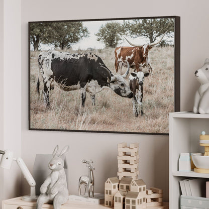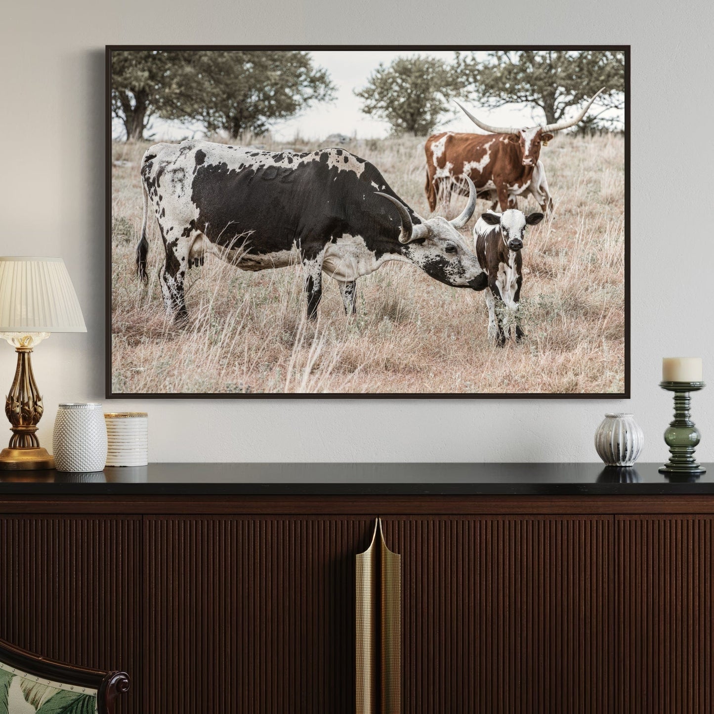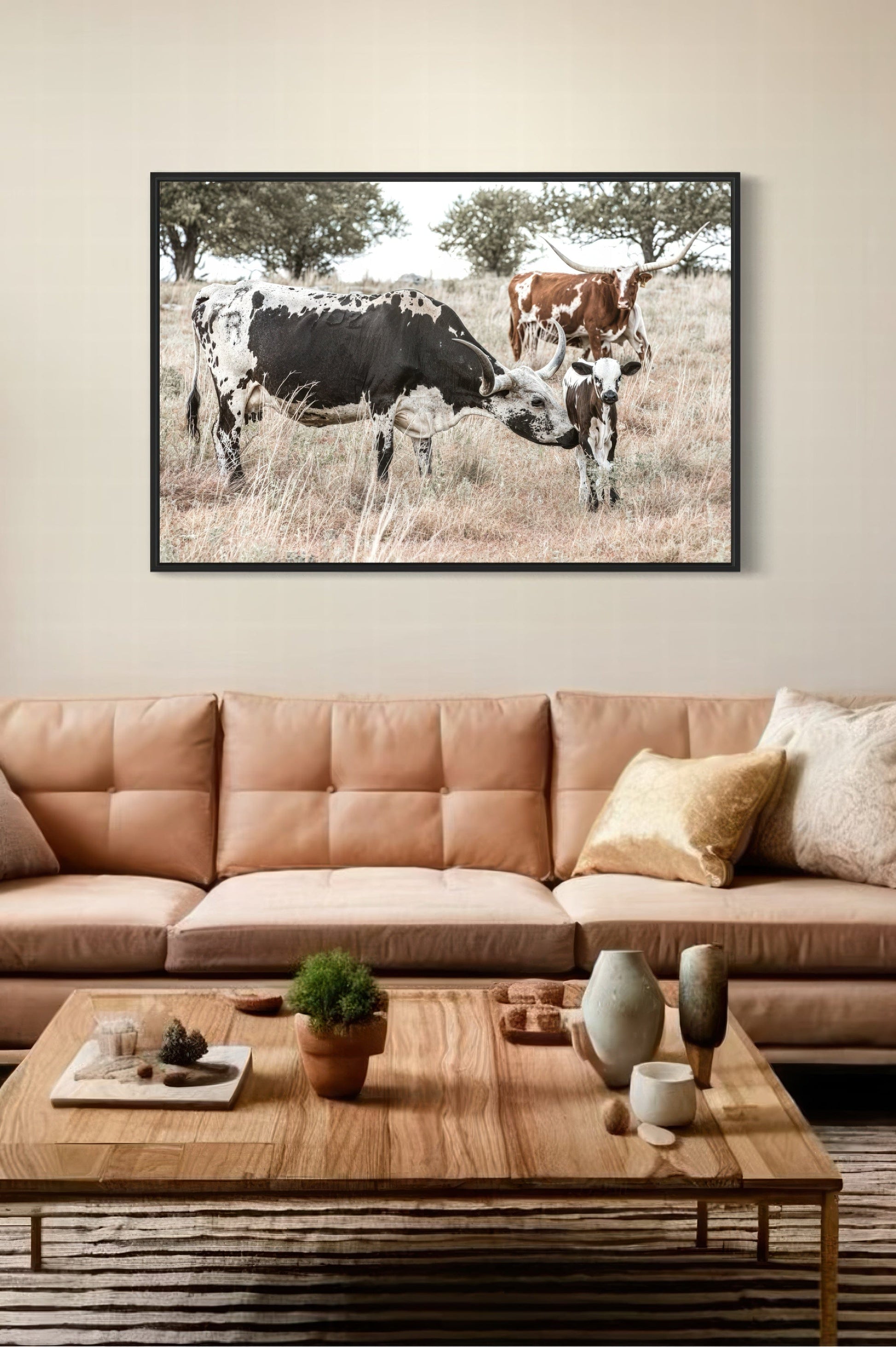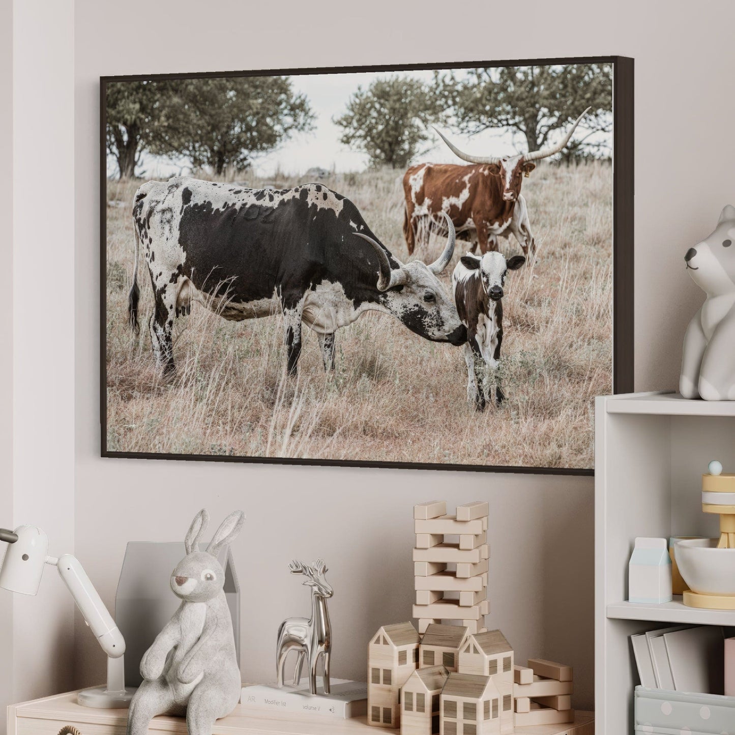 Perfect for those decorating a nursery with a cowboy theme, this wall art brings a slice of the great American outdoors inside. The longhorn cows and their calves, photographed in the Flint Hills, offer a serene yet inspiring scene that encourages a connection with nature and cowboy heritage from an early age.