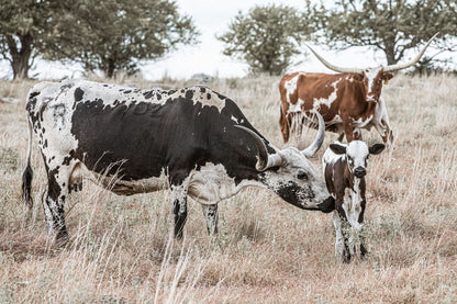 Introduce the timeless spirit of the American prairie to your little cowboy or cowgirl's nursery with our Cowboy Nursery Decor Wall Art. This heartwarming photo captures two longhorn cows with their calves, set against the backdrop of Kansas's Flint Hills.