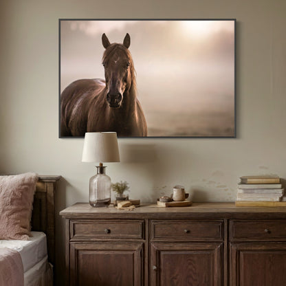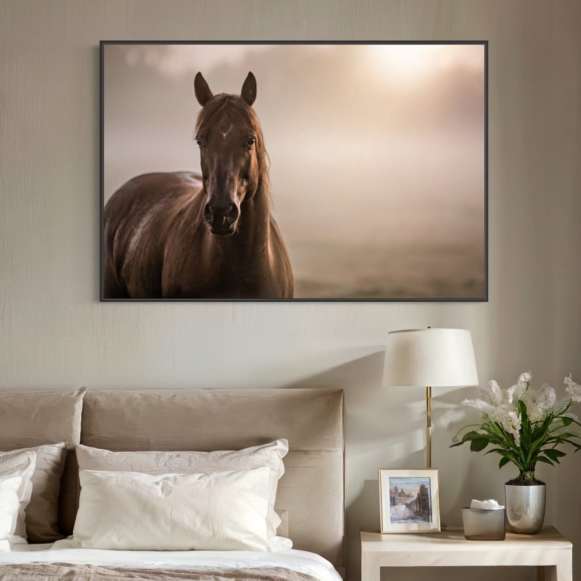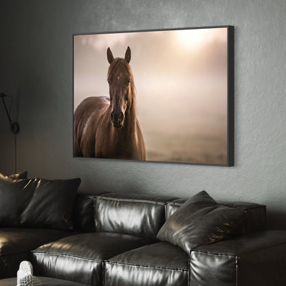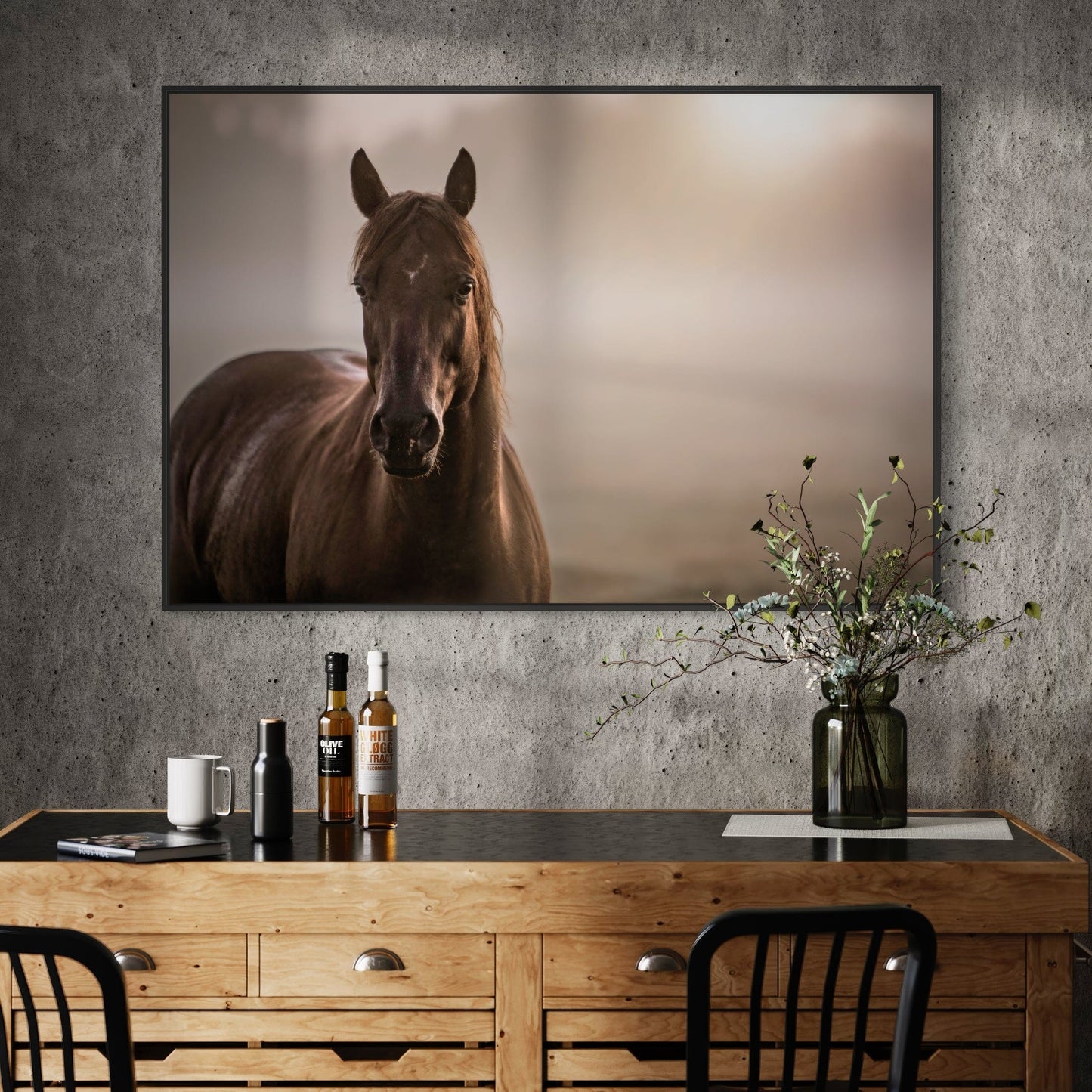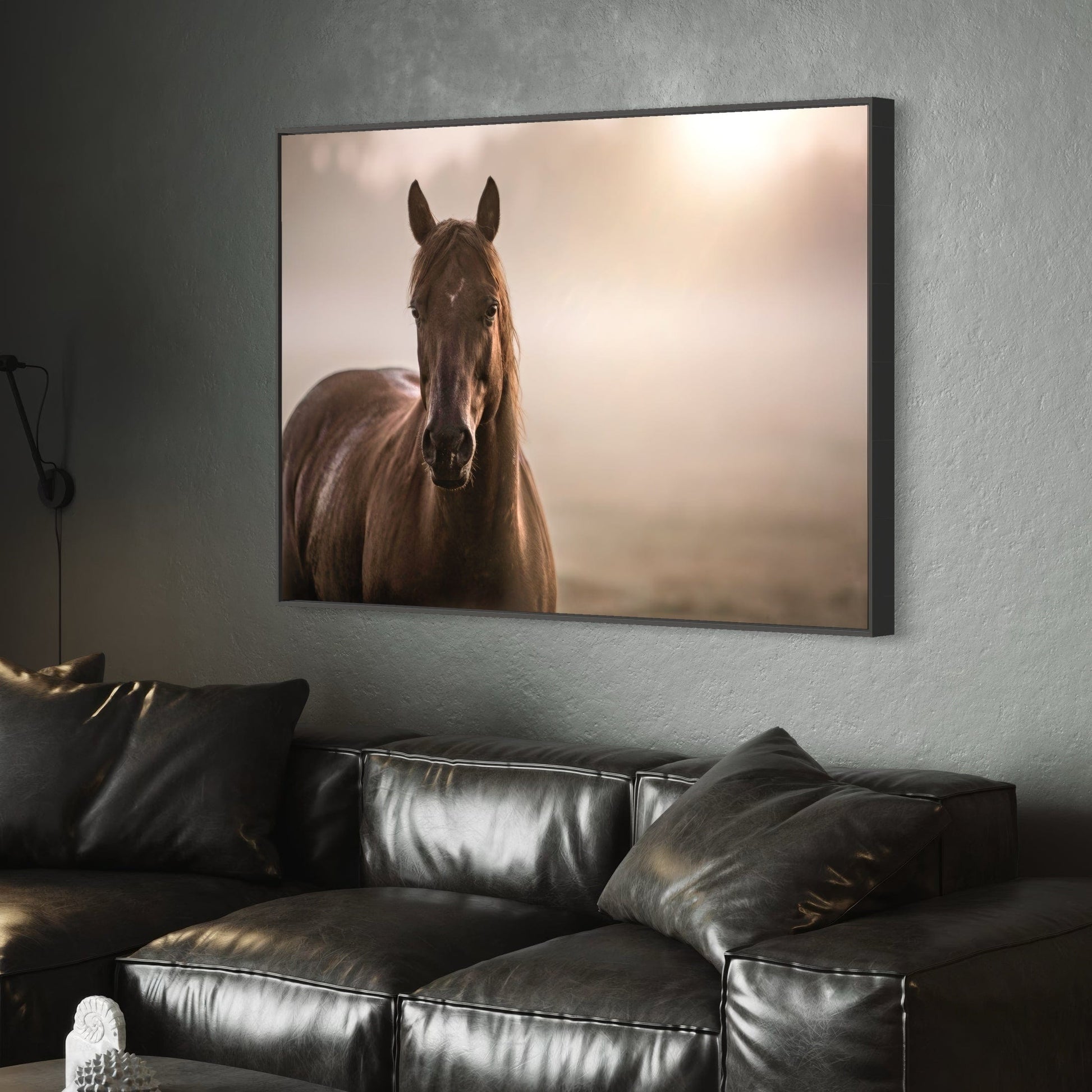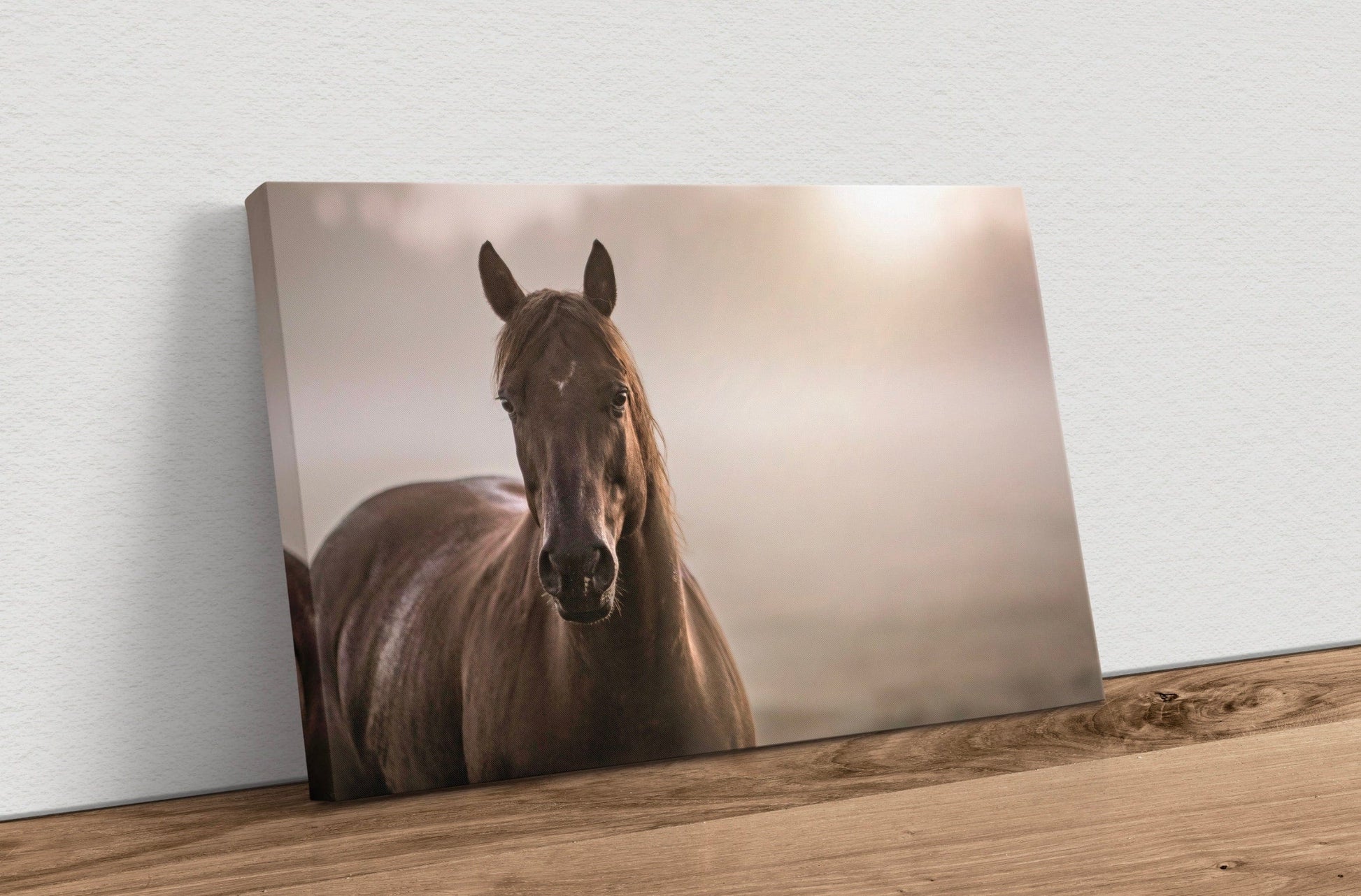 Bring the serene essence of a foggy morning on the pasture into your home with the Horse Decor Canvas Print. Its muted colors exude a peaceful atmosphere that will complement any decor style.