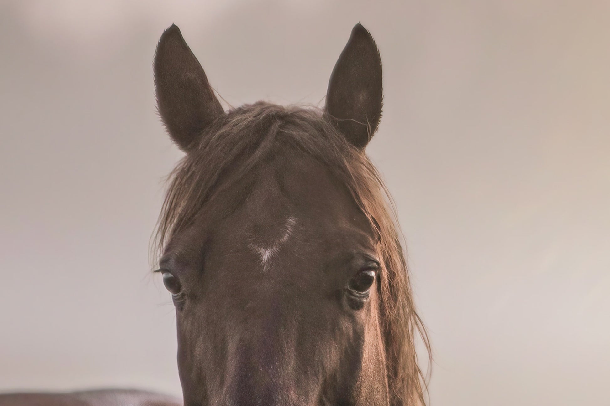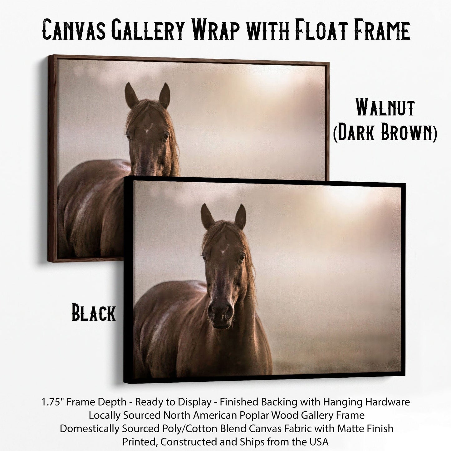 - horse photography, foggy weather canvas print, large horse framed print, large float framed horse artwork, horse in foggy pasture, muted color western art
