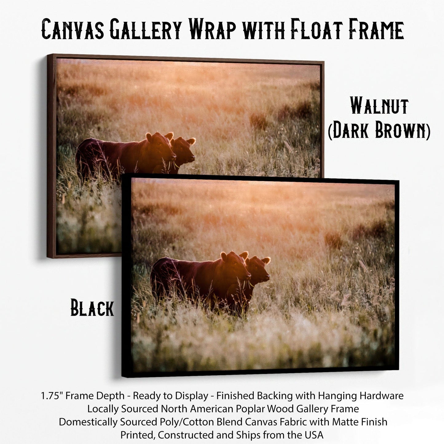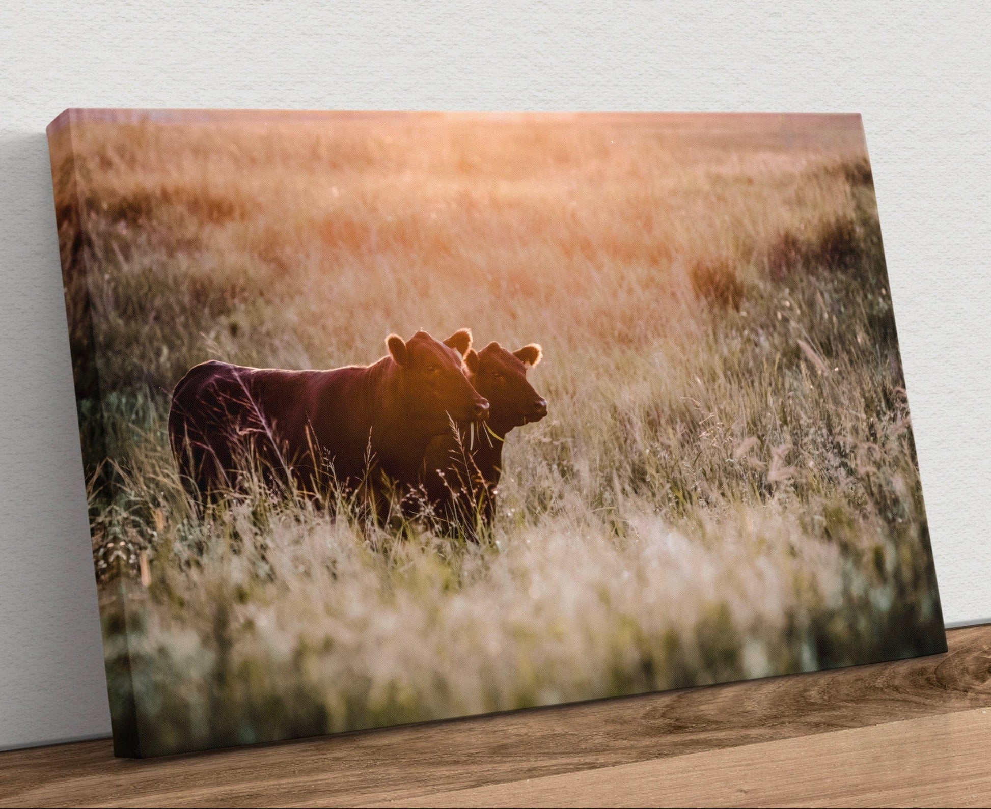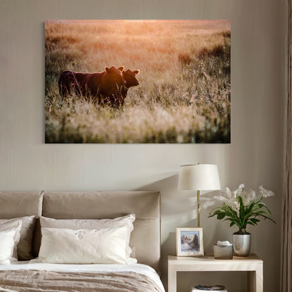 Black Angus Cattle at Sunset is a beautiful wall art canvas print to add to your rustic western living room! Transform your living space into a rustic western retreat with the stunning print of Black Angus cattle at sunset. Available in a variety of sizes, up to an impressive 40" x 60", this large wall art canvas is the perfect addition to any room.