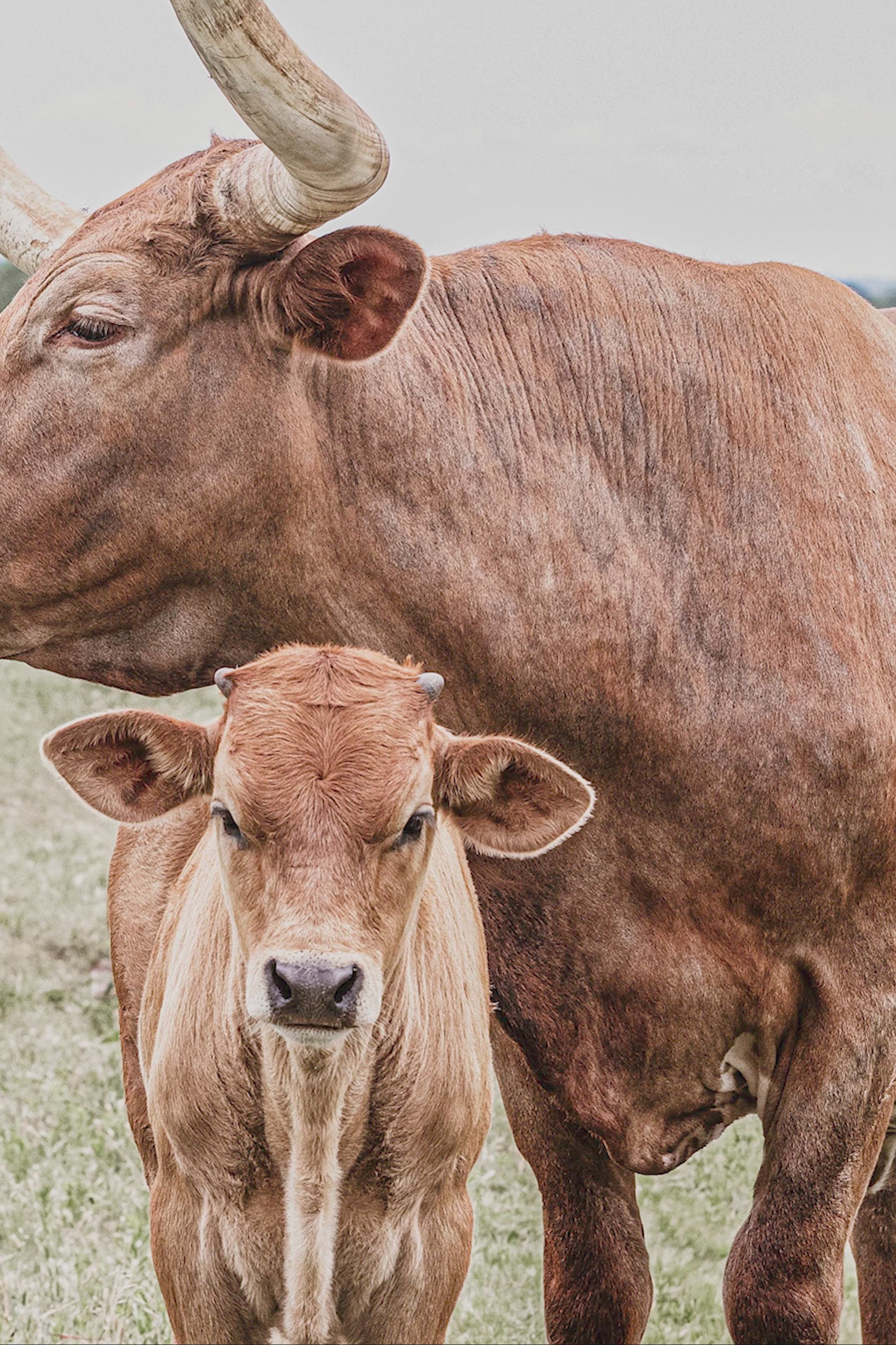 Bring Texas into your home with this vertical Longhorn Art Canvas Print. This unique photo of a Texas Longhorn cow and calf fits perfectly into a western living room or above a fireplace mantle.