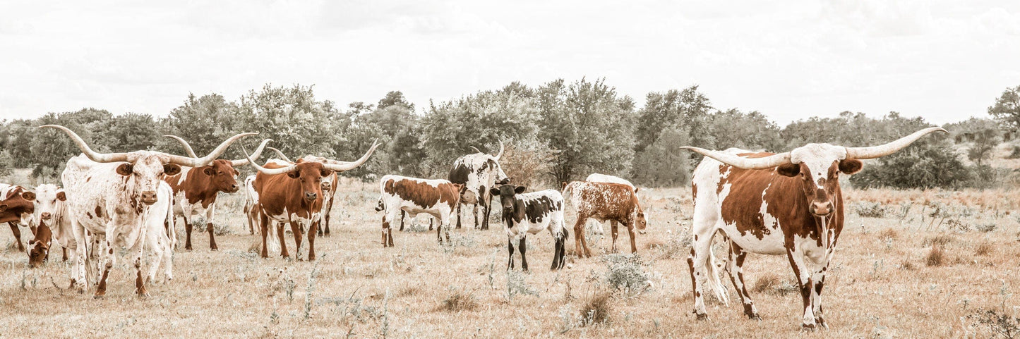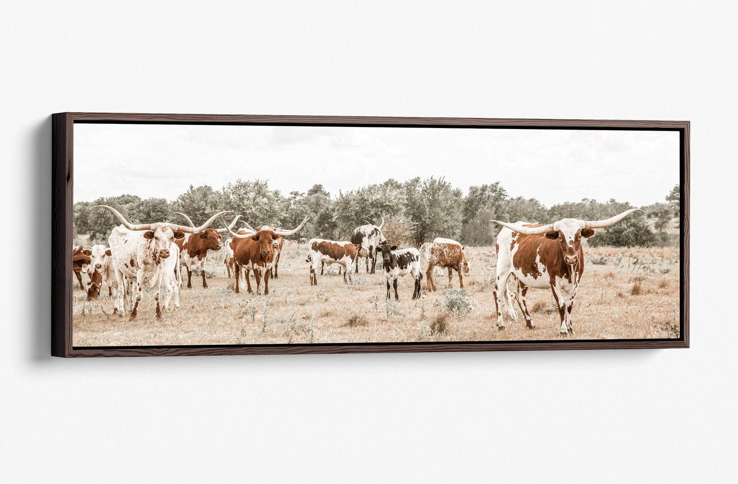This Longhorn Panoramic Canvas Wall Art captures a herd of Texas Longhorn cattle in the rolling Flint Hills of Kansas.