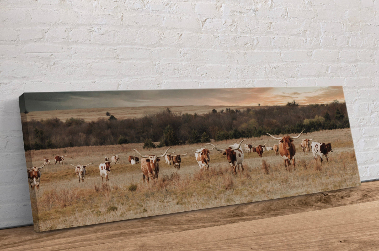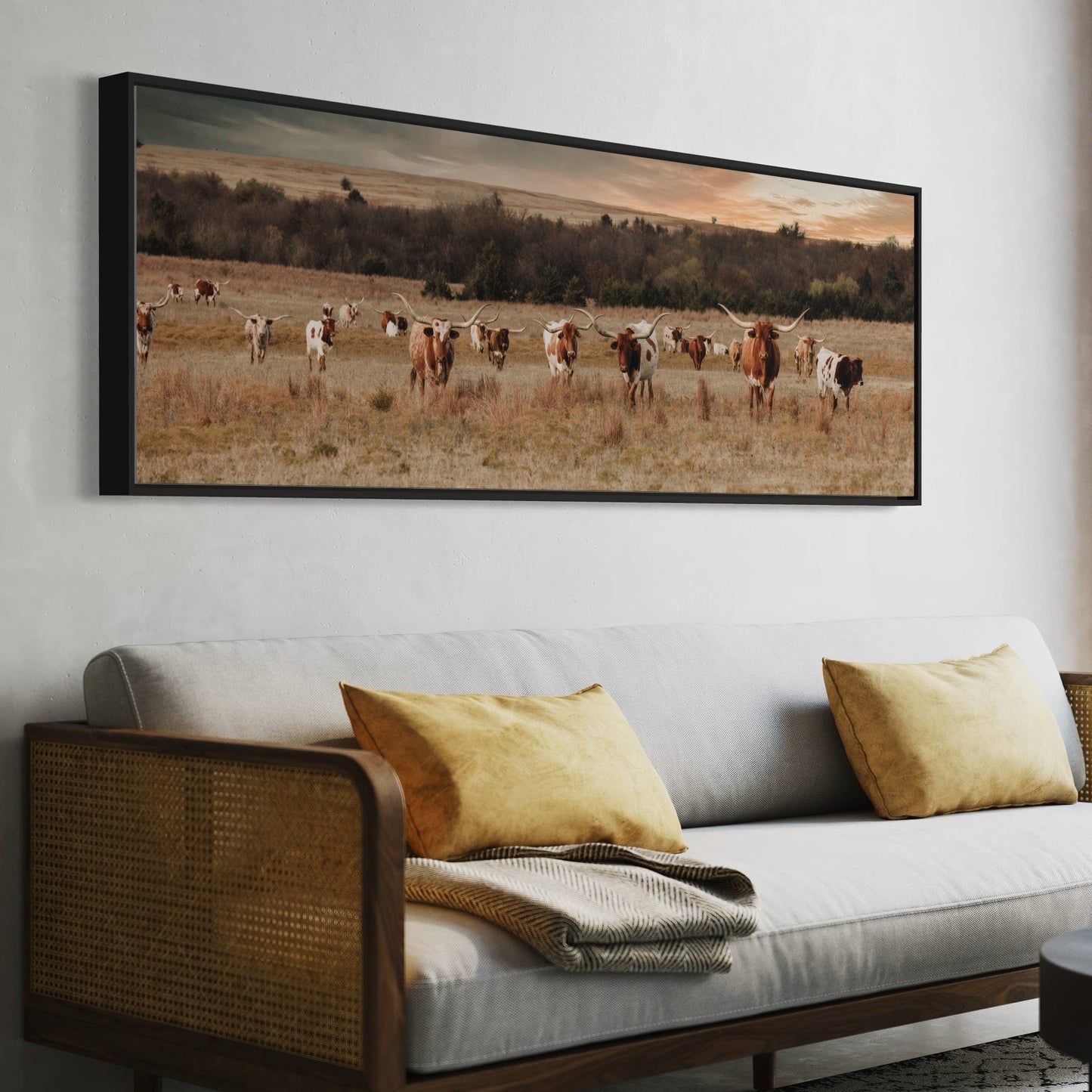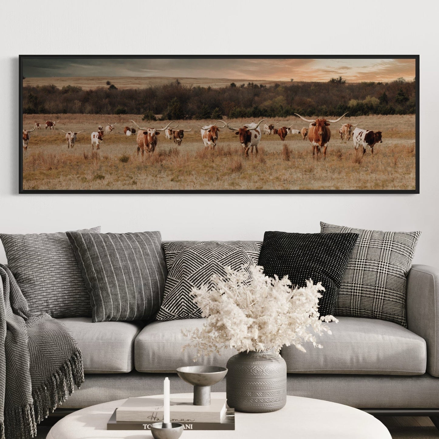 - longhorn panorama print, large Texas Longhorn art, picture of Texas longhorns, Texas themed wall art, longhorn wall art, large longhorn print, longhorn art ready to hang, framed longhorn picture, western panoramic, longhorn herd