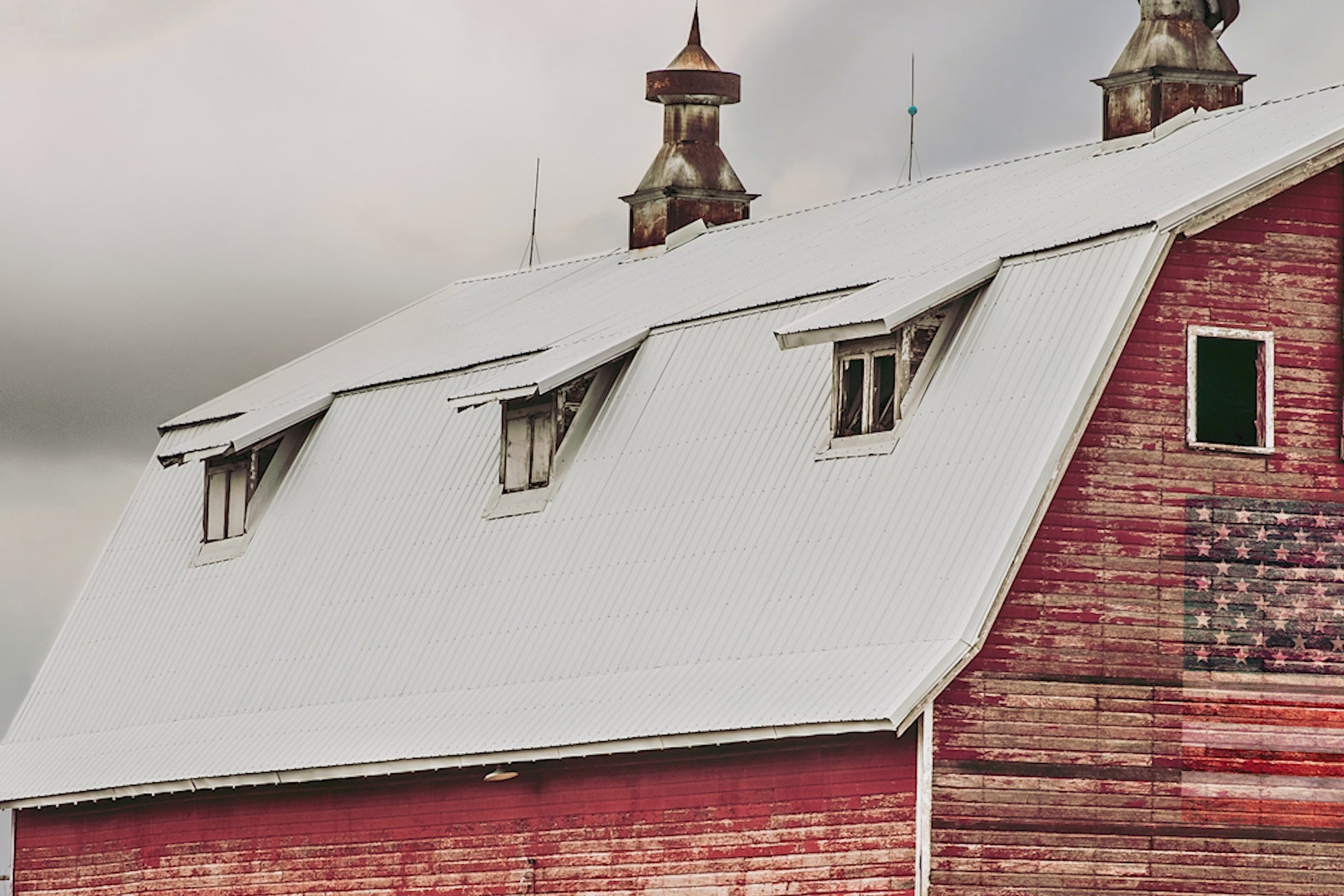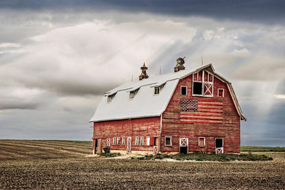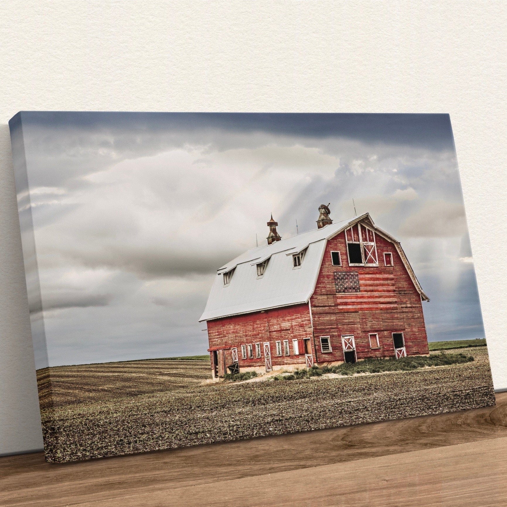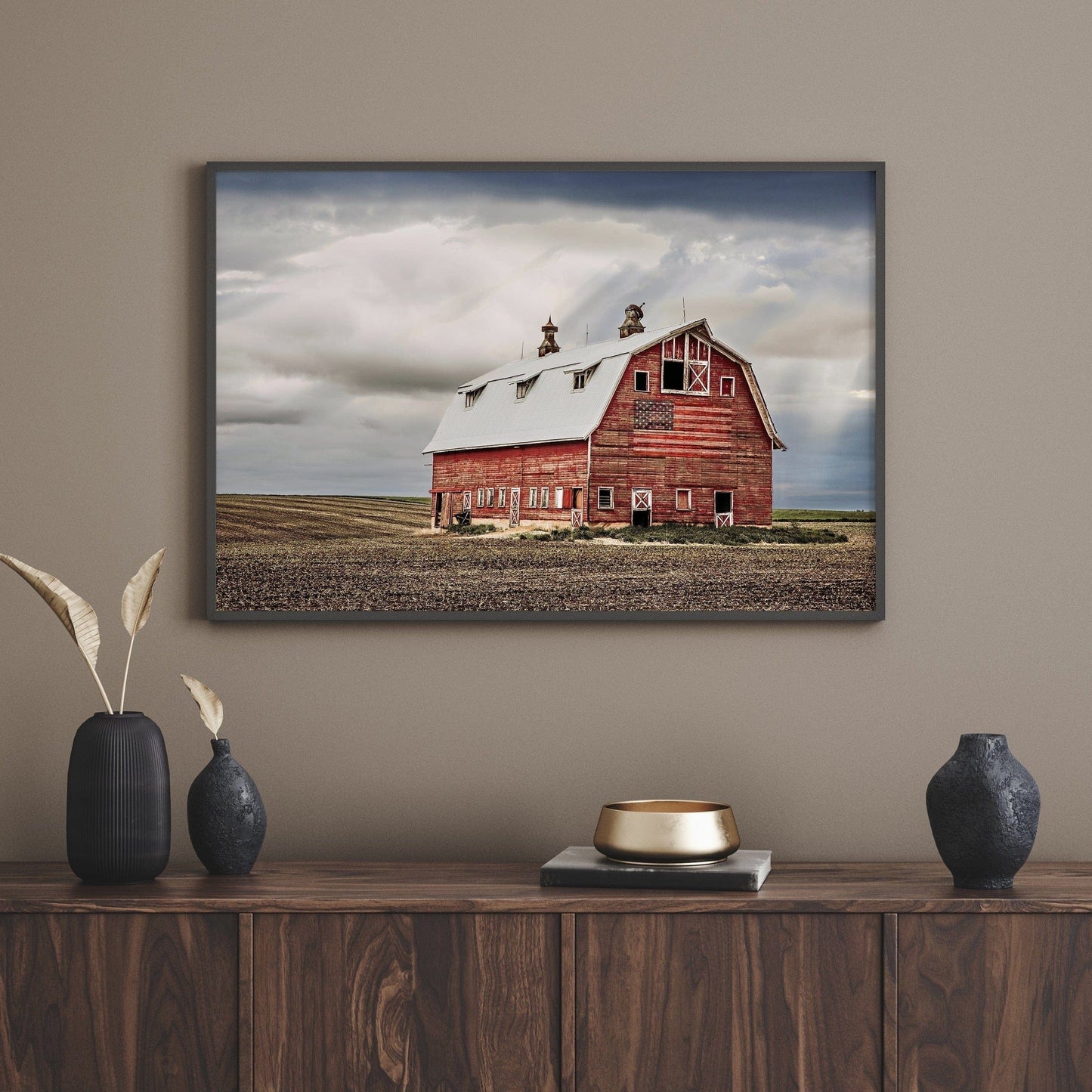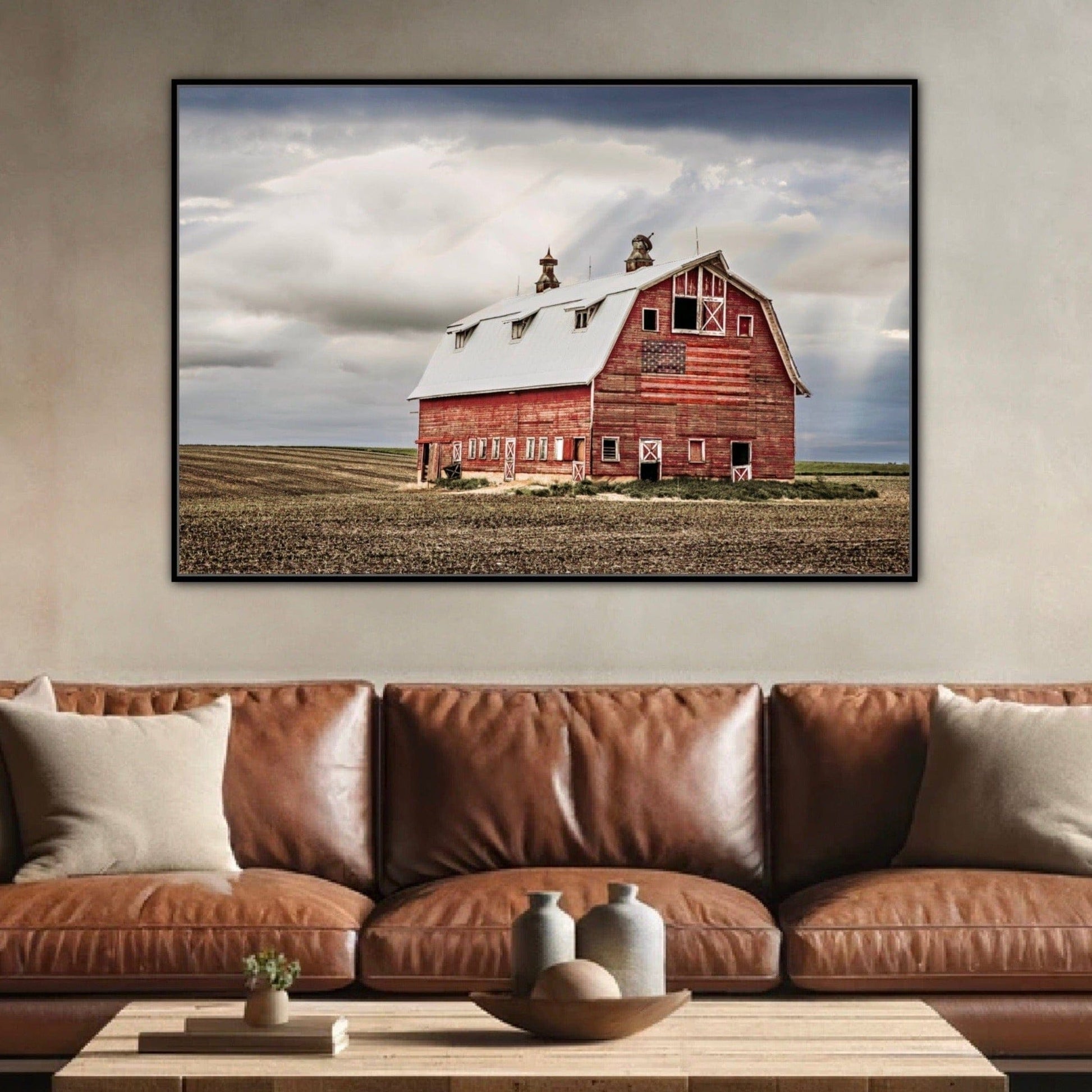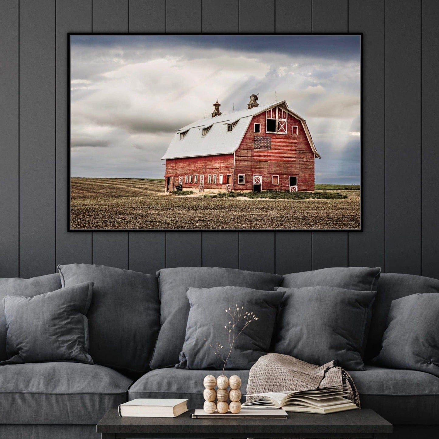 - old barn with American flag, large Americana canvas, old red barn photo, barn photography, patriotic photo print, rustic farmhouse artwork, wall art for dining room, home office decorations, barn picture