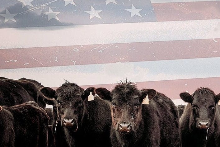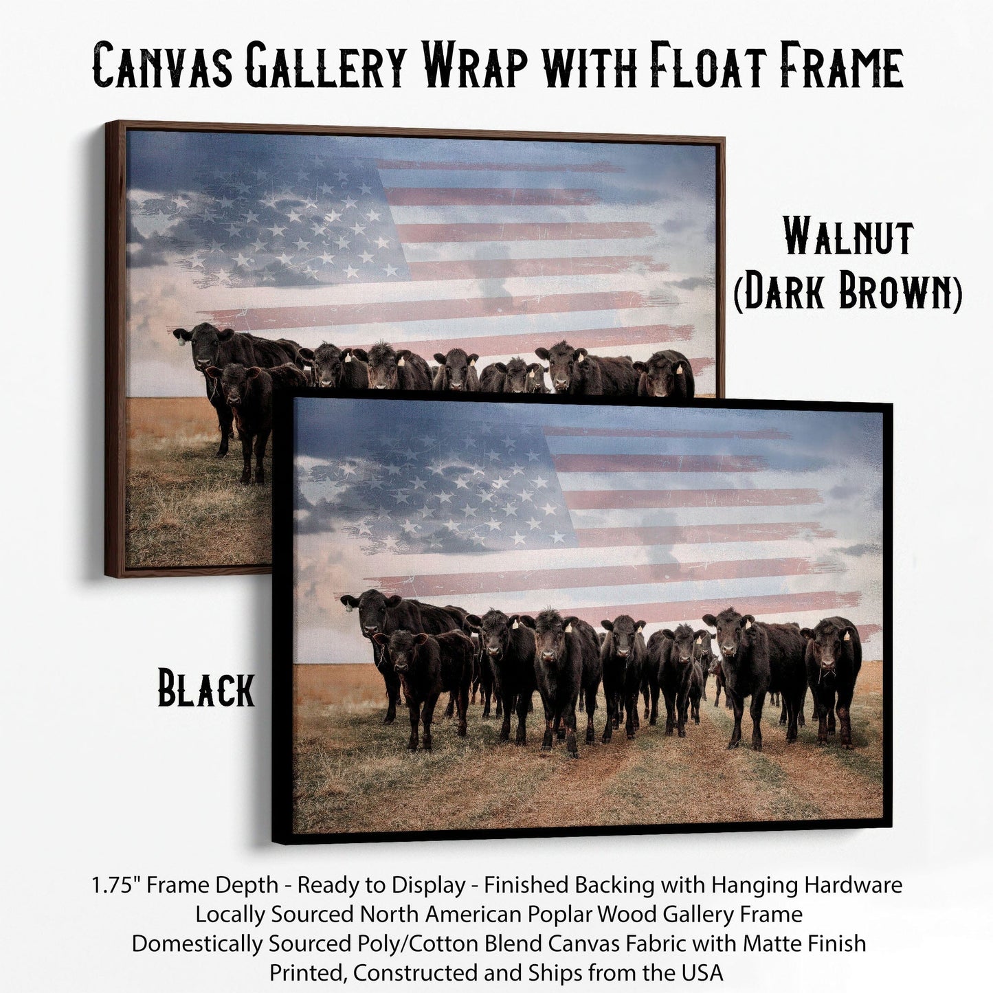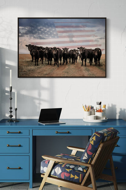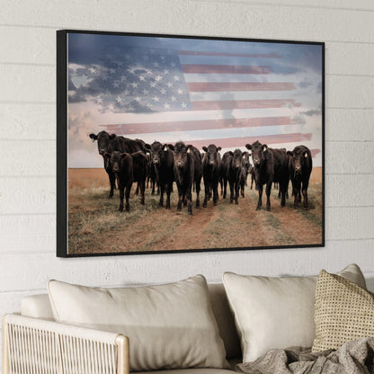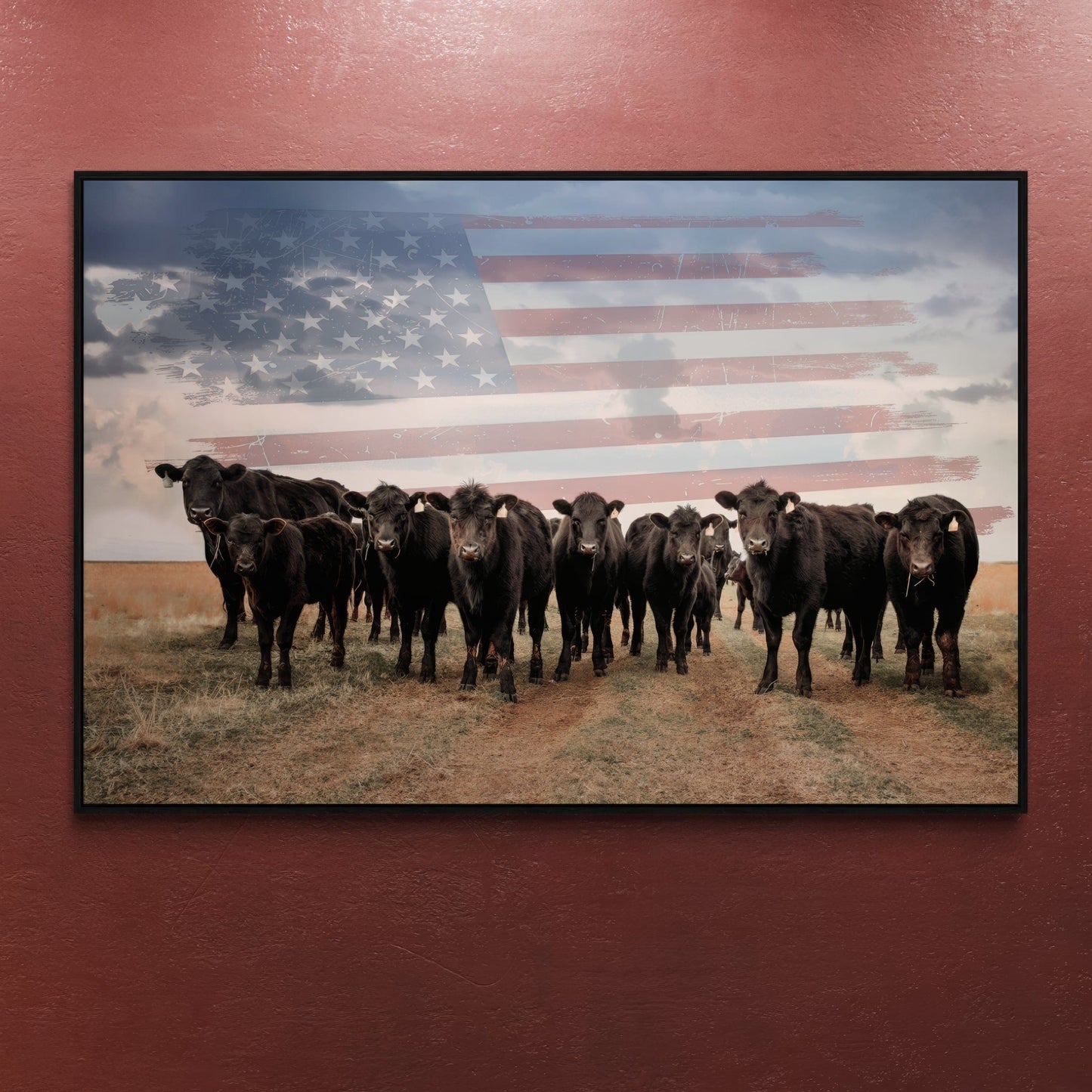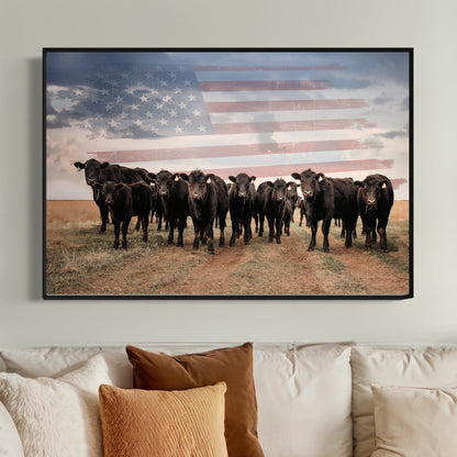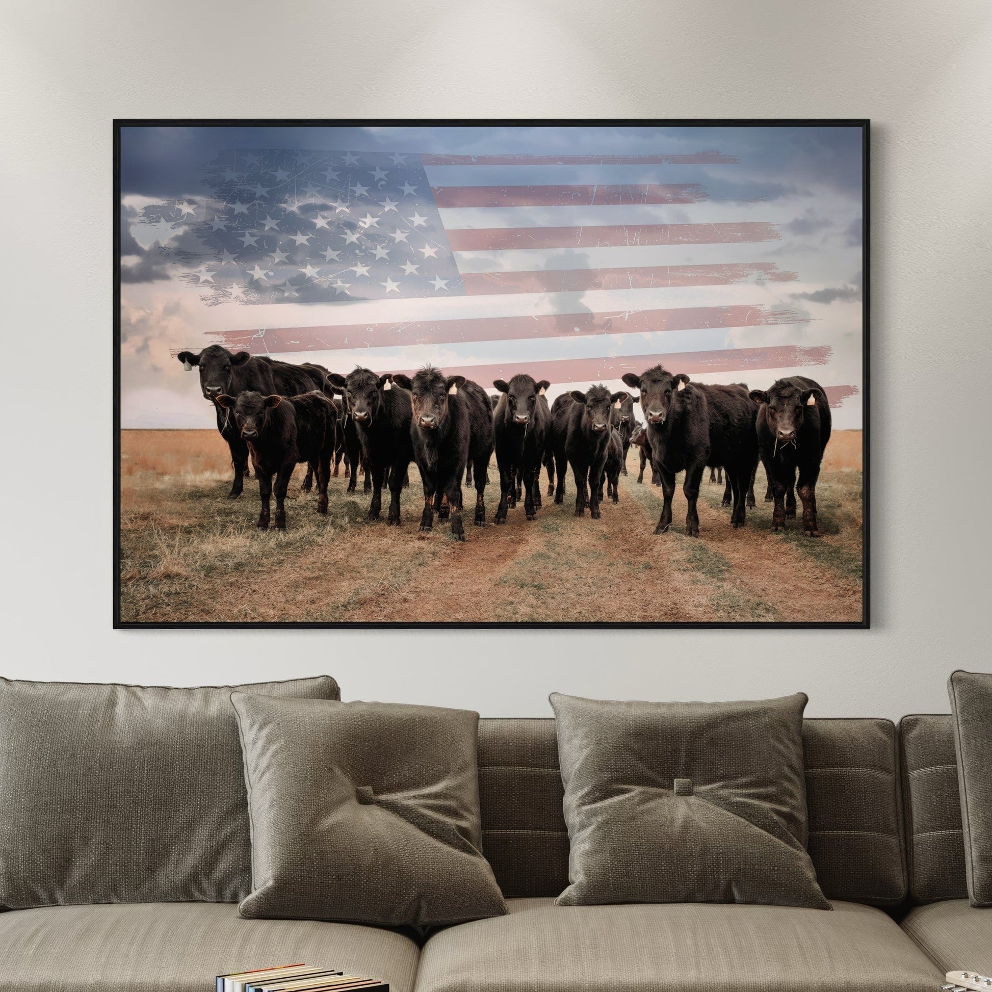 - patriotic wall art, American flag art, framed American flag print, angus cows on canvas, large patriotic western art, framed black angus art, large framed canvas print, ranch decor wall art, ranch style home decor