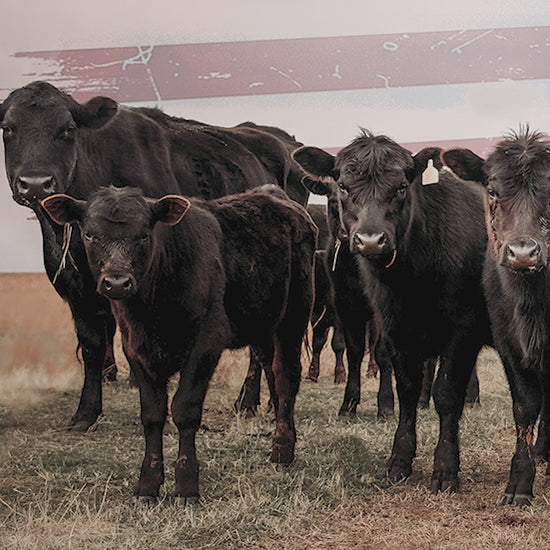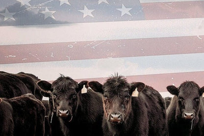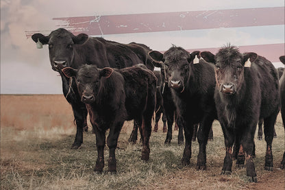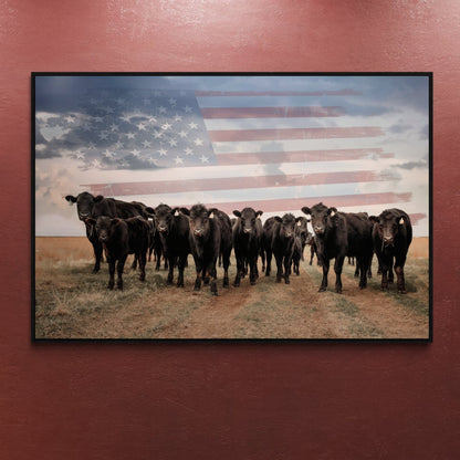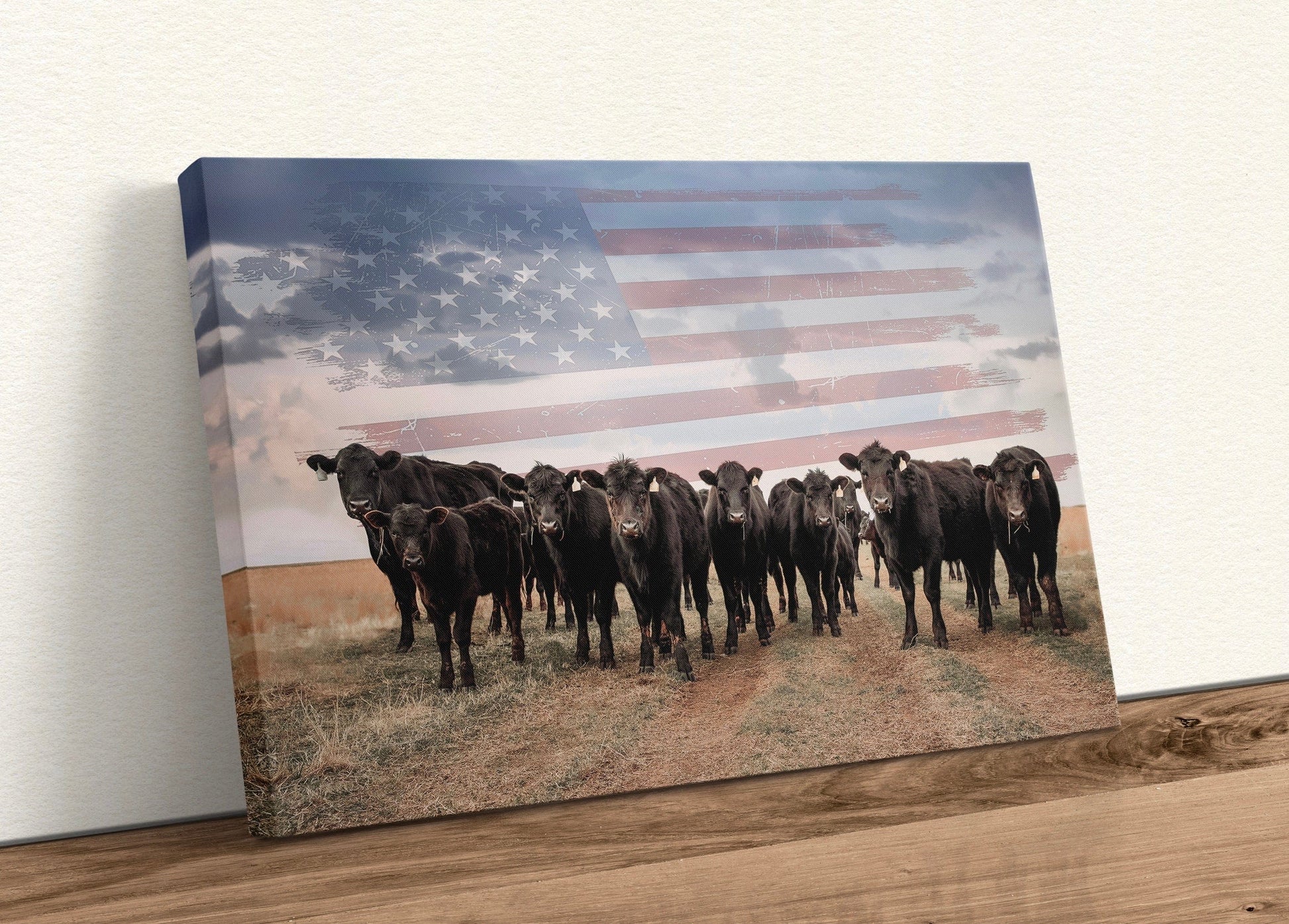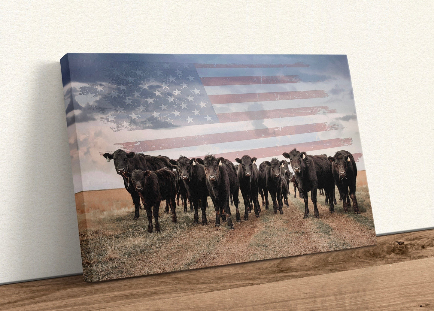 Show off your pride in America with our Patriotic Black Angus Cattle with American Flag art. Perfect for adding a touch of sophistication to any living room, office, or dining room. Let our premium and high-quality artwork decorate your space with a touch of Western charm.