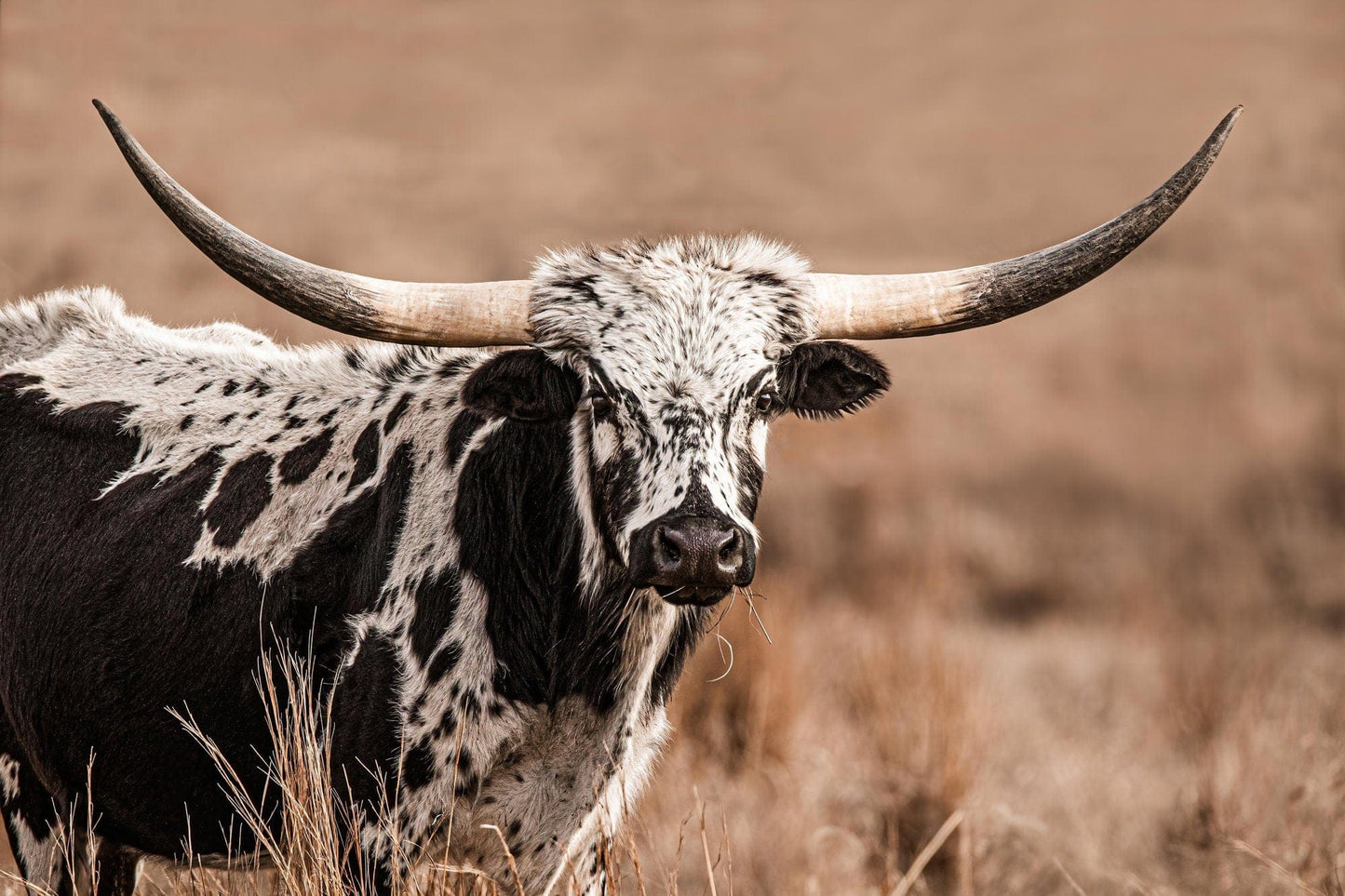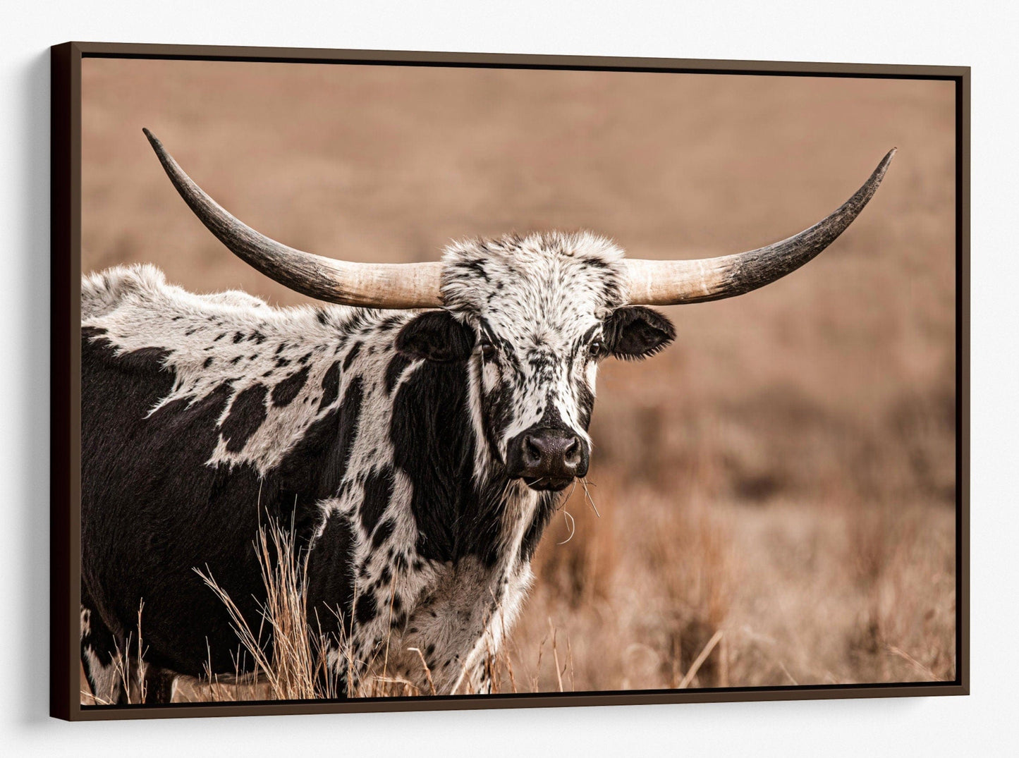 - art for western themed home, large longhorn canvas, longhorn photography, float framed cow canvas, black and white longhorn