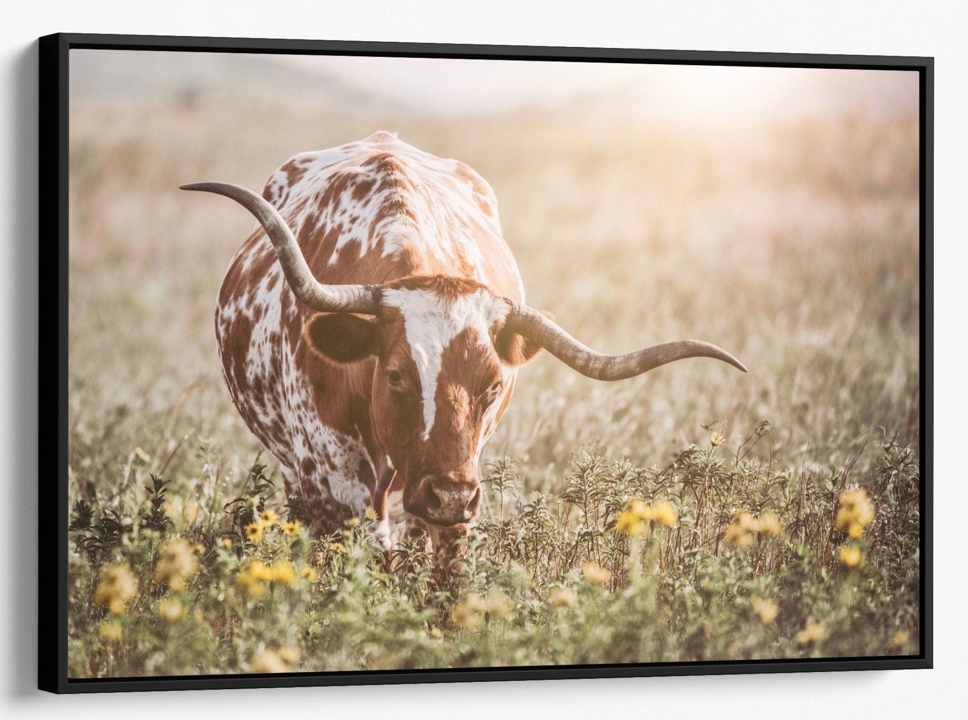 Bring the essence of the countryside into your home with our Rustic Farmhouse Artwork, showcasing a Texas Longhorn cow meandering through a field of bright yellow wildflowers. This canvas art is the perfect addition to any space looking to capture the warmth and simplicity of rustic farmhouse decor.
